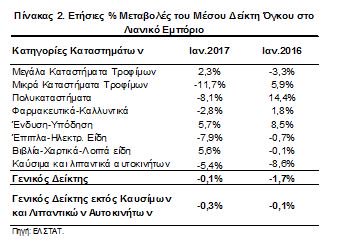 Το Λιανικό Εμπόριο το 2017: Ο δείκτης όγκου στο λιανικό εμπόριο (κύκλος εργασιών σε σταθερές τιμές) έμεινε σχεδόν αμετάβλητος τον Ιανουάριο του 2017 (-0,1%), έναντι πτώσης 1,7% τον Ιανουάριο του 2016. Από την ανάλυση των ετήσιων μεταβολών προκύπτει ότι η μεγαλύτερη μείωση προήλθε από την κατηγορία «καύσιμα και λιπαντικά αυτοκινήτων» κατά 5,4%.