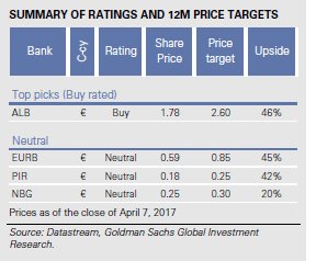Μάλιστα, η Goldman Sachs, στην τελευταία 9σέλιδη ανάλυσή της υπό τον τίτλο "Greece Local Picture: Local business back in black in 2016; headwinds in 1Q17" (Ελλάδα: Οι τοπικές δραστηριότητες και πάλι στο "πράσινο", αντιξοότητες το α' 3μηνο του 2017), που σας παρουσιάζει το www.bankingnews.gr, επιβεβαιώνει τη σύσταση buy (αγορά) που έχει για την Alpha Bank, ενώ είναι neutral (ουδέτερη) για την Πειραιώς, την Eurobank και την Εθνική.