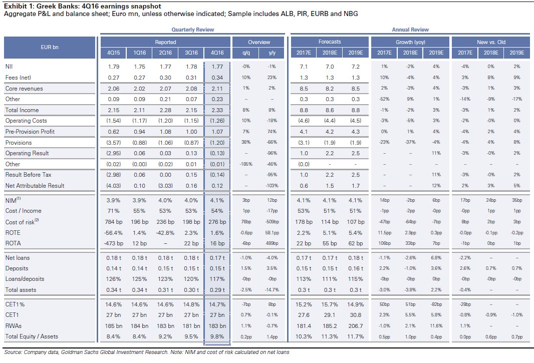 Όπως αναφέρει η Goldman Sachs, οι ελληνικές τράπεζες αντέστρεψαν τις απώλειες των προηγούμενων ετών (> 12 δισ. ευρώ το 2014-15 συνολικά) το 2016, ενώ οι προοπτικές για το 2017 παραμένουν συγκρατημένα αισιόδοξες, παρά την κακή αρχή του έτους.