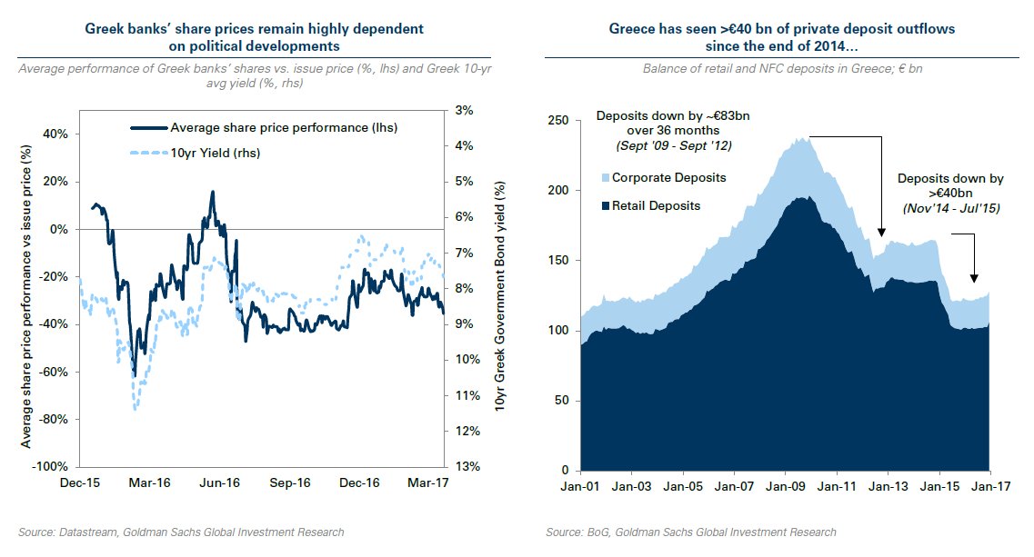 Ειδικότερα, στην 86σέλιδη ανάλυση υπό τον τίτλο "European Banks, Sector overview and Conviction List stocks" (Ευρωπαϊκές τράπεζες, ανάλυση τομέα και η λίστα μετοχών) που σας παρουσιάζει το www.bankingnews.gr, η Goldman Sachs επαναλαμβάνει ότι οι μετοχές του ελληνικού τραπεζικού κλάδου εξαρτώνται από τις πολιτικές εξελίξεις, γεγονός που αποτυπώνεται και στην πορεία της καταθετικής βάσης.