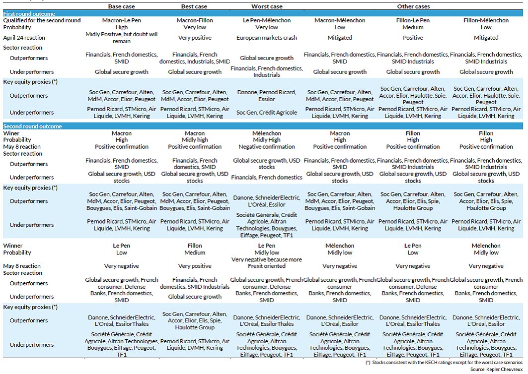 Με βάση την ανάλυση της Kepler στο βασικό σενάριο και το πιο πιθανό όπου στον δεύτερο γύρο περάσουν Macron και Le Pen οι αγορές θα αντιδράσουν θετικά - αν και συγκρατημένα - καθώς θα ποντάρουν σε νίκη του Macron.