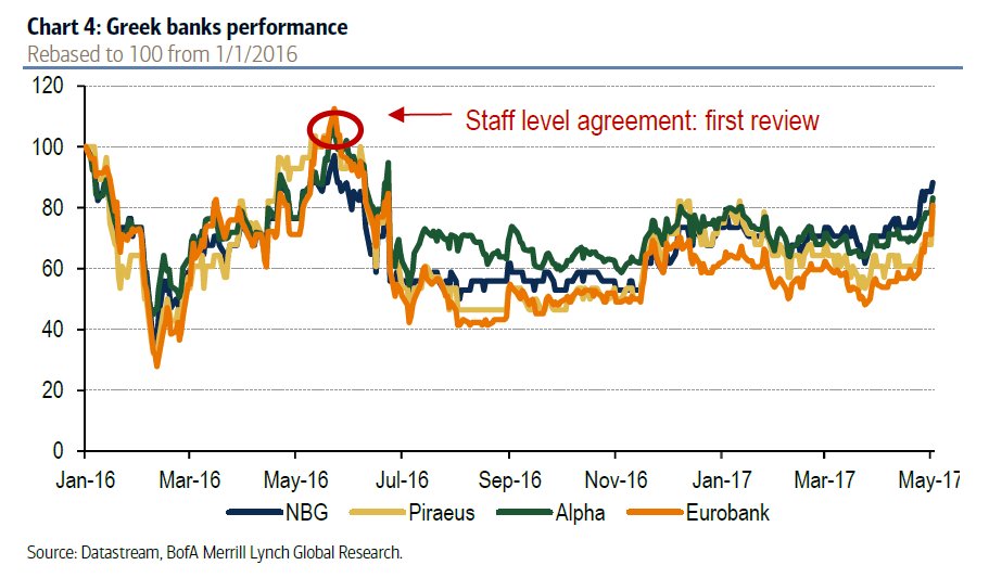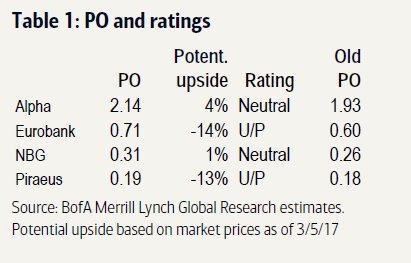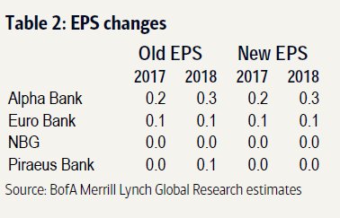 Υπενθυμίζεται εδώ ότι χτες (4/5) η Bank of America αύξησε οριακά τις οριακά τις τιμές στόχους των ελληνικών τραπεζών, αλλά μείωσε τις εκτιμήσεις για τα κέρδη.