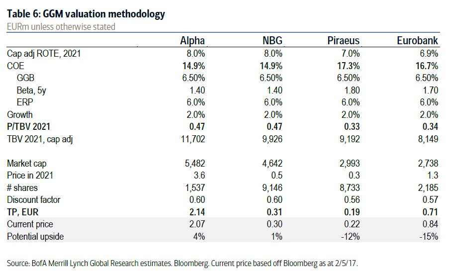 Για την αποτίμηση χρησιμοποιεί μέσο όρο στον δείκτη COE στην τάξη του 16%, το οποίο και λαμβάνει υπόψιν τις πολιτικές εξελίξεις και τους στόχους των NPLs.