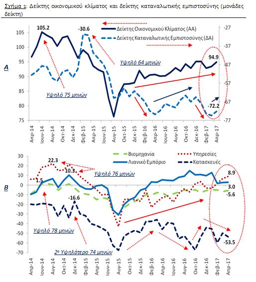 Ο δείκτης οικονομικού κλίματος (στοιχεία ΙΟΒΕ) σημείωσε μηνιαία βελτίωση τον Απρίλιο 2017. Διαμορφώθηκε στις 94,9 μονάδες δείκτη (ΜΔ) από 93,4 και 92,9 ΜΔ τον Μάρτιο και τον Φεβρουάριο 2017 αντίστοιχα.