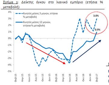 Σύμφωνα με τα στοιχεία της ελληνικής στατιστικής αρχής (ΕΛΣΤΑΤ), ο δείκτης όγκου στο λιανικό εμπόριο (αξία πωλήσεων σε σταθερές τιμές) σημείωσε θετική ετήσια μεταβολή της τάξης του 9,4% τον Φεβρουάριο 2017 από 0,2% τον Ιανουάριο 2017. Τα αντίστοιχα μεγέθη σε όρους μηνιαίας μεταβολής ήταν 3,6% και 0,1% αντίστοιχα. Βάσει αυτών των στοιχείων, η μέση τριμηνιαία μεταβολή διαμορφώθηκε στο 3,0% (κινητός μέσος 3 μηνών) από 1,8% το 4ο τρίμηνο 2016.