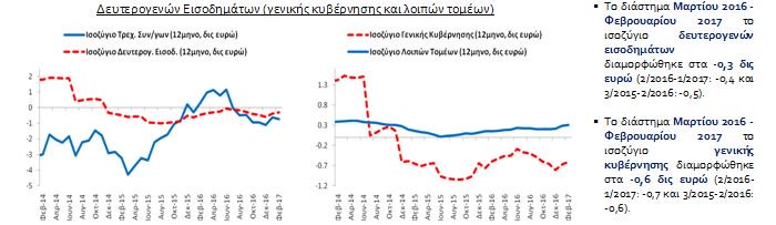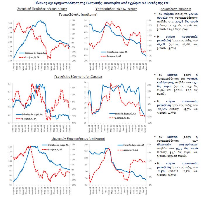 Σε ότι αφορά το επίπεδο της χρηματοδότησης των κατοίκων εσωτερικού πλην ΝΧΙ από τα εγχώρια ΝΧΙ εκτός της ΤτΕ οι μεταβολές είχαν ως εξής: γενικό σύνολο -€1,7 δις σε σχέση με τον Φεβρουάριο 2017 και -€4,0 δις σε σύγκριση με τον Δεκέμβριο 2016, γενική κυβέρνηση -€0,7 και -€1,8 δις, ιδιωτικές επιχειρήσεις -€0,5 και -€1,1 δις και νοικοκυριά -€0,5 και -€0,9 δις.