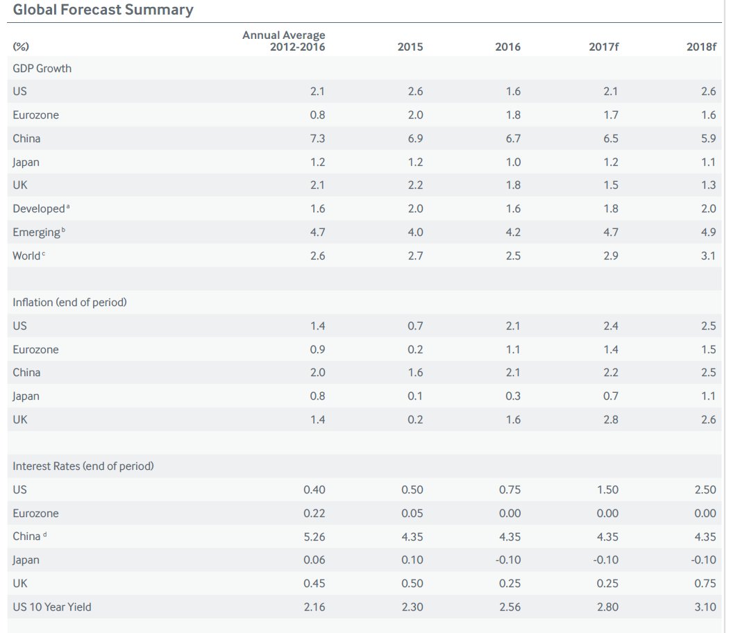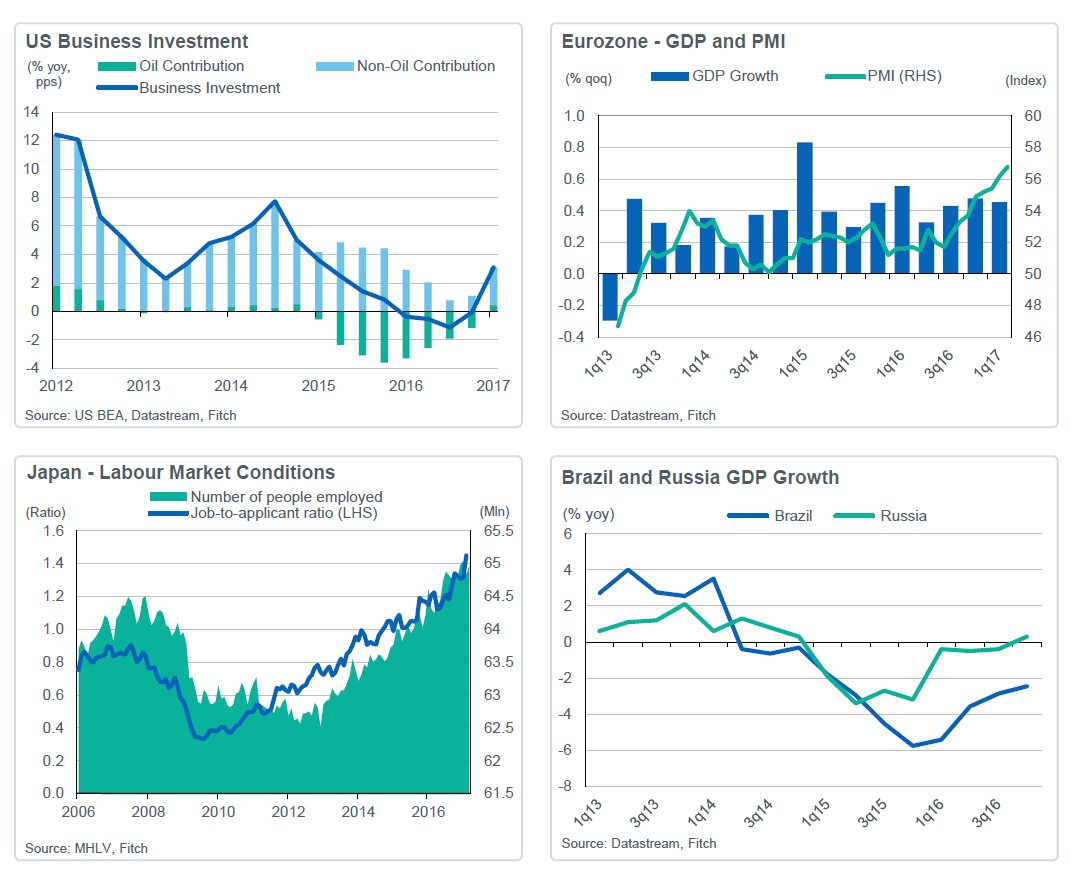 Η πρόβλεψη ανάπτυξης των ΗΠΑ για το 2017 έχει αναθεωρηθεί κατά 0,2 εκατοστιαίες μονάδες (pp), αλλά αυτό αντισταθμίζεται από τις ανοδικές αναθεωρήσεις κατά 0,2 π.μ. στην Κίνα και την Ιαπωνία.