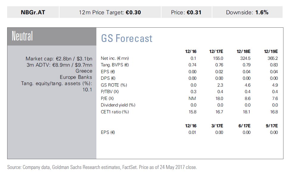 Τη σύσταση της «ουδετερότητας» (neutral) δίνουν στη μετοχή της Εθνικής Τράπεζας η Goldman Sachs και η Bank of America, με την πρώτη να δίνει τιμή στόχο στα 0,30 ευρώ και τη δεύτερη 0,310 ευρώ.