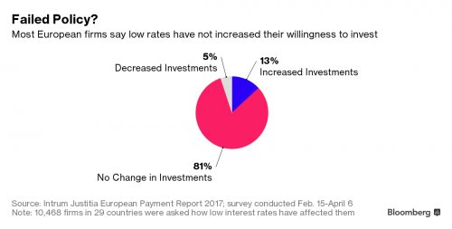 Αλλά το πιο ανησυχητικό εύρημα της έρευνας είναι τα χαμηλά επιτόκια - η μόνη πολιτική στήριξης που υπήρξε κάπως αποτελεσματική στην Ευρώπη τα τελευταία χρόνια, ακόμα και αν αυτό σημαίνει πως ο ισολογισμός της ΕΚΤ είναι τώρα ο μεγαλύτερος στον κόσμο - έχουν χάσει την αποτελεσματικότητά τους και μόνο το 13% των επιχειρήσεων στην έρευνα δήλωσαν το χαμηλό κόστος δανεισμού τις έχει οδηγήσει σε αύξηση των επενδύσεων τους, με το 81% να μην αναφέρουν καμία αλλαγή.