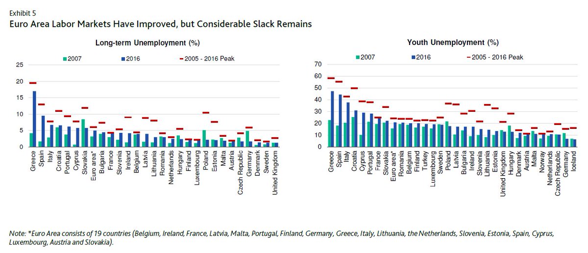 Άλλωστε, σχεδόν το ήμισυ των ανέργων είναι μακροχρόνια άνεργοι, και το ποσοστό των υποαπασχολούμενων εργαζομένων παραμένει σε υψηλά επίπεδα, ειδικά στην περιφέρεια της Ευρωζώνης.
