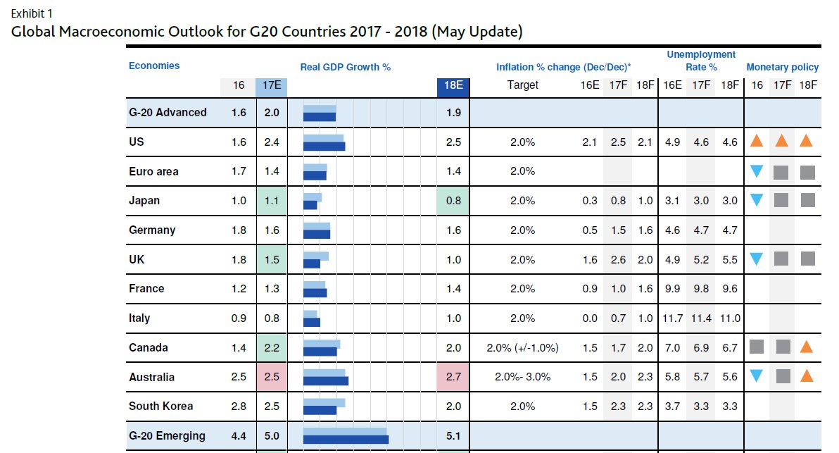 Ειδικότερα, στη σημερινή ανάλυσή της για την πορεία της παγκόσμιας οικονομίας, το αποτέλεσμα των γαλλικών προεδρικών εκλογών μειώνει σημαντικά τον κίνδυνο εξόδου μιας μεγάλης οικονομίας από την Ευρωζώνη, ενώ η γερμανική οικονομία ενισχύει τη δυναμική της, στηριζόμενη στην αύξηση των καταναλωτικών και κρατικών δαπανών που σχετίζονται με την εισροή προσφύγων.