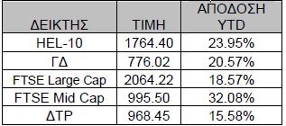 Όλοι σχεδόν οι κύριοι δείκτες εξακολουθούν να παρουσιάζουν απόδοση μεγαλύτερη του 15% από την αρχή του έτους με τον FTSE Mid Cap να ξεπερνά το 30%.