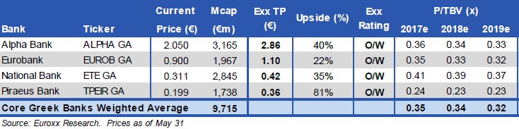 Overweight παραμένει η Euroxx για τις ελληνικές τράπεζες, εκτιμώντας ότι υπάρχει δυνατότητα ανόδου για τις μετοχές 22%-81% από τα τρέχοντα επίπεδα.