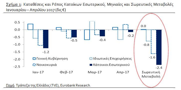 Σε σύγκριση με τον Μάρτιο 2017 καταγράφηκε μείωση -€153,5 εκατ. και σε σχέση με τον Δεκέμβριο 2016 η σωρευτική πτώση ήταν -€2,4 δις. Στις επιμέρους κατηγορίες που συνθέτουν το σύνολο των καταθέσεων κατοίκων εσωτερικού, οι μηνιαίες και οι σωρευτικές μεταβολές τον Απρίλιο 2017 είχαν ως εξής: γενική κυβέρνηση (αύξηση €159,8 εκατ. σε σχέση με τον Μάρτιο 2017 και ενίσχυση €19,3 εκατ. σε σύγκριση με τον Δεκέμβριο 2016), ιδιωτικές επιχειρήσεις (-€665,3 και -€767,1 εκατ.) και νοικοκυριά (€352,0 και -€1.620,7 εκατ.). Τα προαναφερθέντα στοιχεία παρατίθενται αναλυτικά στο Σχήμα 1.