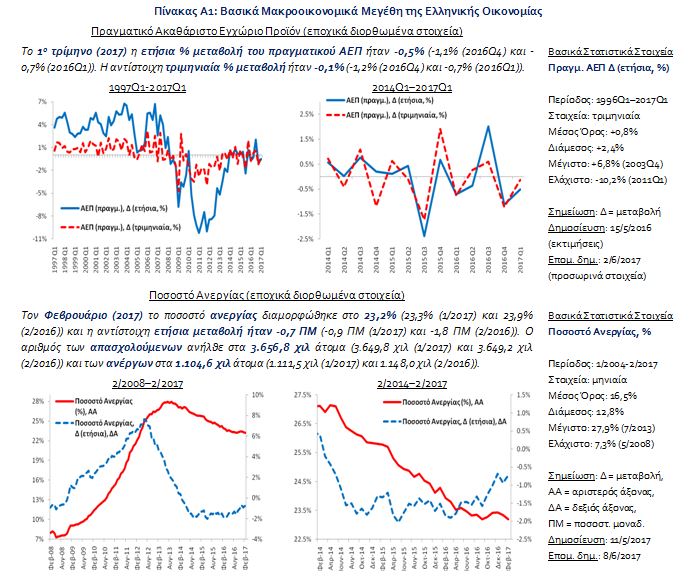 Η μηνιαία επιδείνωση του δείκτη οικονομικού κλίματος προήλθε από την πτώση των δεικτών εμπιστοσύνης στις κατασκευές (κατά -13,9 ΜΔ), στη βιομηχανία (-4,8 ΜΔ) και στο λιανικό εμπόριο (-1,5 ΜΔ). Οι αντίστοιχοι δείκτες στους τομείς των υπηρεσιών και του καταναλωτή παρουσίασαν ενίσχυση κατά 2,6 και 2,5 ΜΔ αντίστοιχα. Αξίζει να σημειωθεί ότι ο δείκτης εμπιστοσύνης στις υπηρεσίες παρέμεινε σε ανοδική τροχιά για 4ο συνεχή μήνα καταγράφοντας υψηλό 29 μηνών τον Μάιο 2017. Τέλος, ο δείκτης εμπιστοσύνης καταναλωτή κατέγραψε θετική μηνιαία μεταβολή για 2ο συνεχή μήνα και ανήλθε σε υψηλό 4 μηνών.