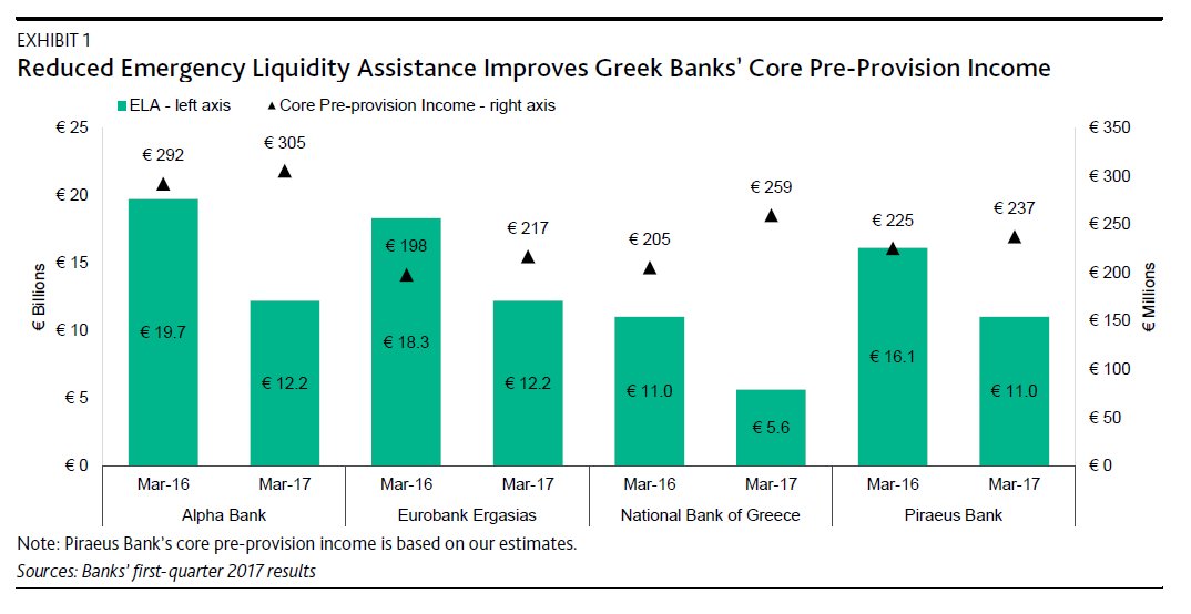 Ειδικότερα, στην 33σέλιδη σημερινή της ανάλυση για το outlook των αγορών τον Ιούνιο, η Moody's αφιερώνει ειδικό κεφάλαιο για την Ελλάδα, υπό τον τίτλο "Greek Banks' Reduced Emergency Liquidity Assistance Improves Their Profitability" (η μείωση του ELA από τις ελληνικές τράπεζες βελτιώνει την κερδοφορία τους).