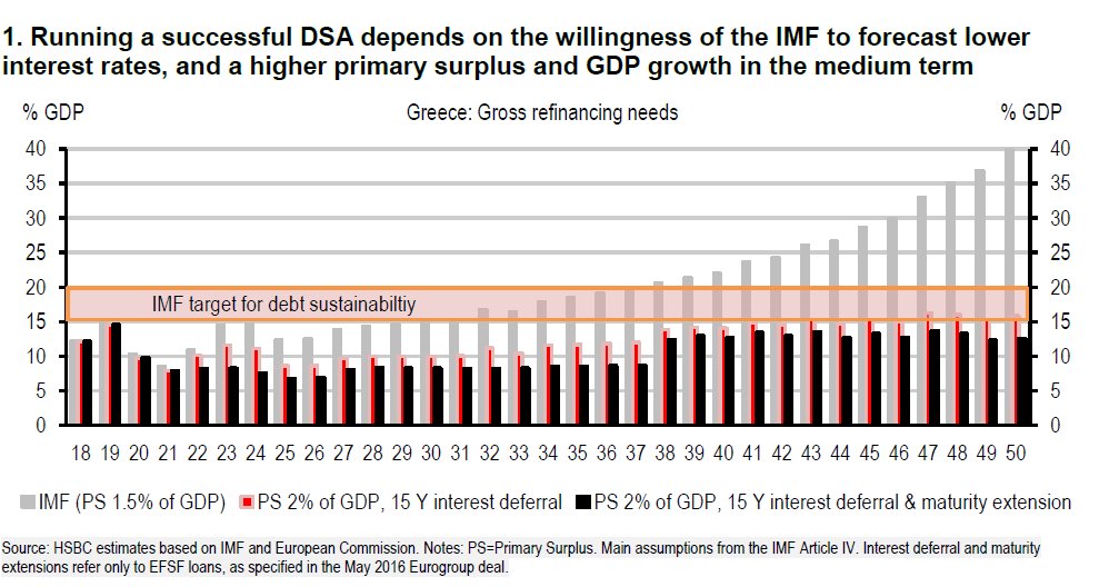 Κατά την άποψη της HSBC, τα μέτρα ελάφρυνσης του χρέους που αποφασίστηκαν τον Μάιο του 2016, εάν εφαρμοστούν πλήρως, θα πρέπει να είναι αρκετά για να ανταποκριθούν στα κριτήρια του ΔΝΤ.