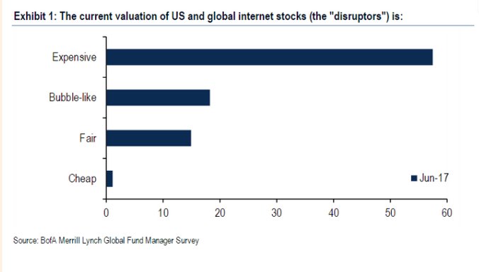 Μετά από μια εβδομάδα κατά την οποία οι παγκόσμιες τεχνολογικές μετοχές έχουν υποστεί πίεση, η μηνιαία έρευνα των χρηματιστηριακών διευθυντών της BAML αποκαλύπτει ότι το 44% πιστεύει ότι οι μετοχές είναι ακριβές.