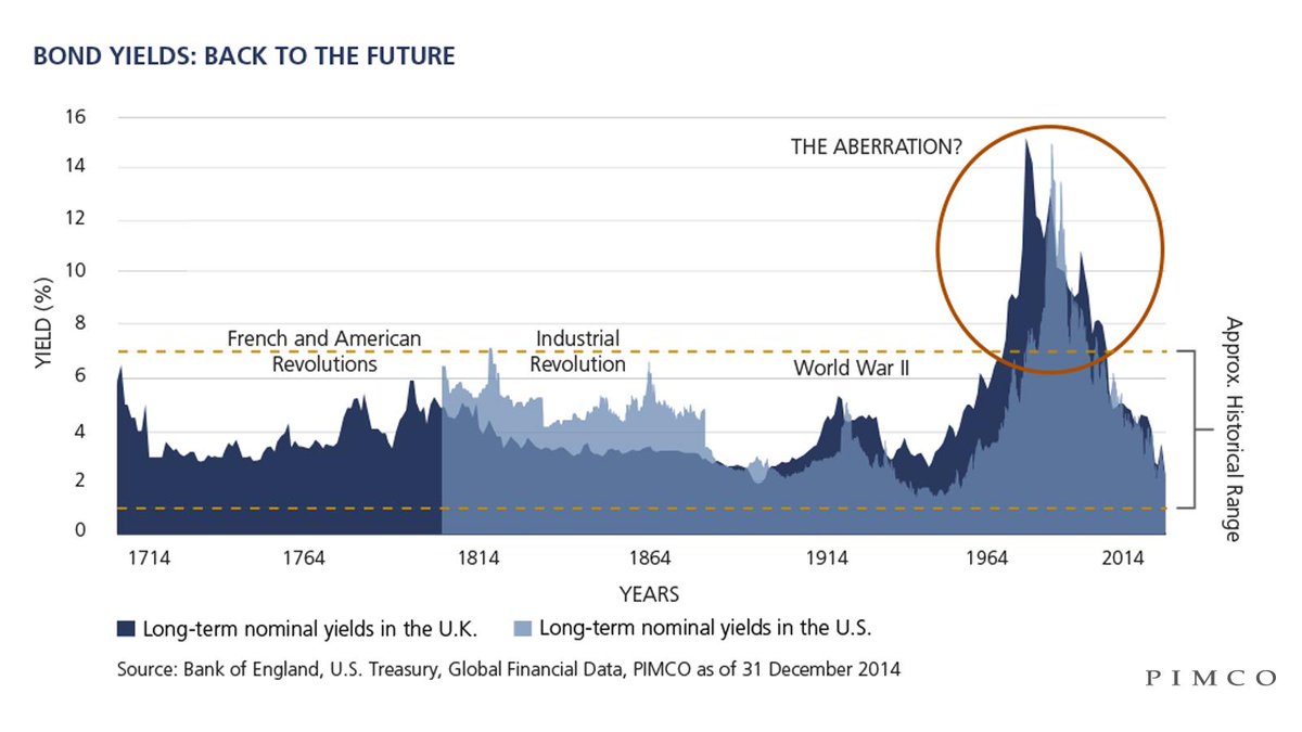 Η πτώση τριών 10ετιών των αποδόσεων στα ομόλογα συγκρίνεται με τις δεκαετίες του 1960 και του 1970, όταν οι αποδόσεις αυξήθηκαν σε ιστορικά πρωτοφανή επίπεδα, όπως η Fed προσπάθησε να χαλιναγωγήσει τον πληθωρισμός.