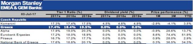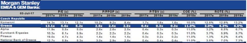 Υπενθυμίζεται εδώ ότι μέσα Ιουνίου, η Morgan Stanley είναι αναφέρει ότι το QE δεν θα αποτελέσει πλέον καταλύτη για τις μετοχές των ελληνικών τραπεζών, με την απόδοση των ομολόγων να βρίσκεται ήδη κάτω από 6% και με το νέο κόστος των ιδίων κεφαλαίων να μειώνεται στο 11%.