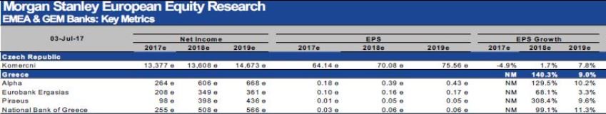 Ειδικότερα, στο chartbook για τον τραπεζικό κλάδο της Ανατολικής Ευρώπης, της Μέσης Ανατολής και της Αφρικής (ΕΕΜΕΑ), η Morgan Stanley διαμορφώνει την τιμή στόχο της Alpha Bank στα 2,8 ευρώ (+29%), της Eurobank στο 1 ευρώ, της Πειραιώς στα 0,30 ευρώ (+30%) και της Εθνικής στα 0,40 ευρώ (+23%).