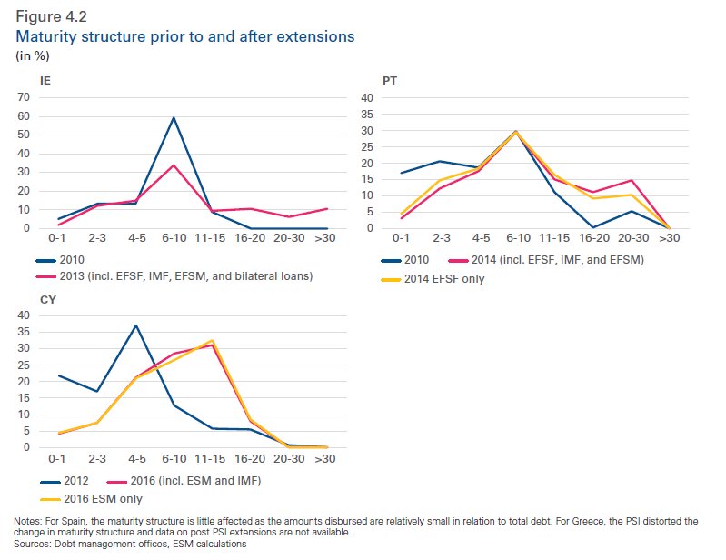 Οι συνθήκες δανεισμού του EFSF / ESM είχαν μια σημαντική θετική εξέλιξη στη διάρθρωση του χρέους και στις πέντε χώρες του προγράμματος, καθώς μειώθηκαν οι κίνδυνοι αναχρηματοδότησης, επηρεάζοντας θετικά τις αντιλήψεις της αγοράς.