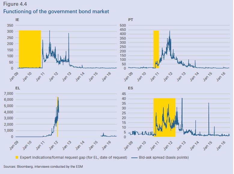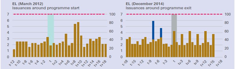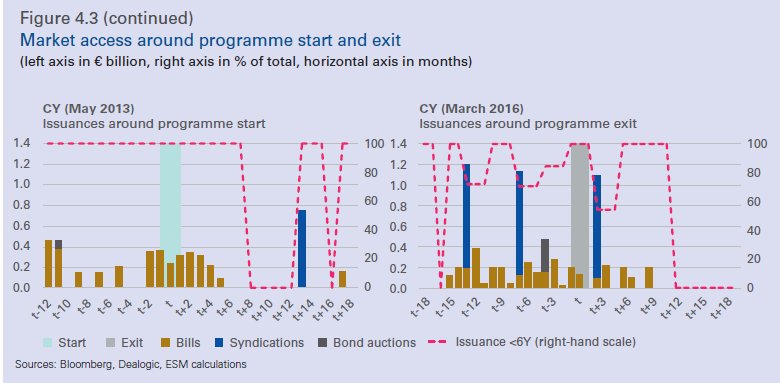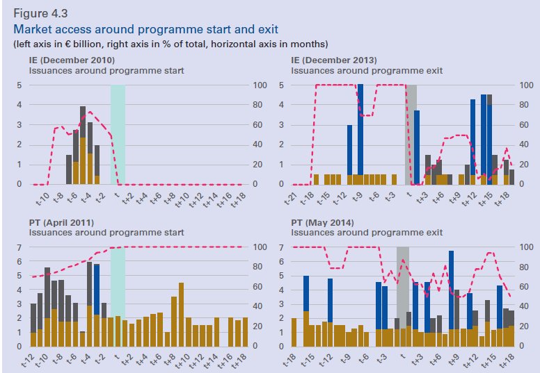 Οι τέσσερις χώρες προγραμμάτων, η Πορτογαλία, η Ισπανία, η Ιρλανδία και η Κύπρος, επέστρεψαν ή διατηρούσαν την πρόσβαση στην αγορά κατά τη διάρκεια της περιόδου των προγραμμάτων.
