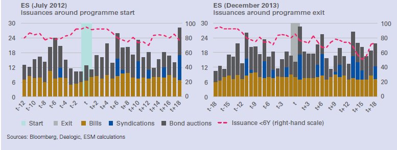 Στην περίπτωση της Ισπανίας, η μέση διάρκεια των 12,5 ετών της στήριξης του ESM, ενίσχυσε την ωριμότητα μετά τη συγκέντρωση στις βραχυπρόθεσμες εκδόσεις στο πλαίσιο του προγράμματος.