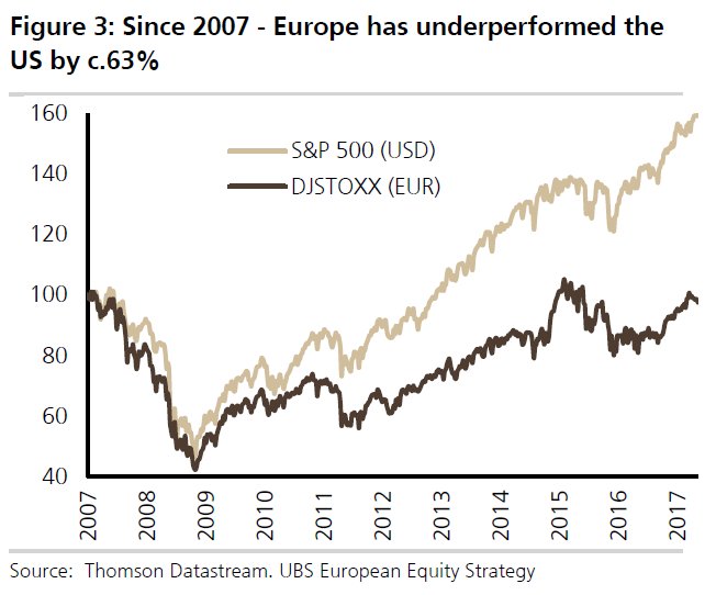 Στην τελευταία 20σέλιδη ανάλυσή της υπό τον τίτλο "Is the 'Buy Europe versus US' already over?" (αγορά Ευρώπης έναντι ΗΠΑ είναι ήδη στο τέλος της;) που σας παρουσιάζει το www.bankingnews.gr, η UBS διαπιστώνει ότι το ευρωπαϊκό ράλι ανόδου μετά την εκλογή Macron (17/5) στη Γαλλία ξεπέρασε κατά 5% της αμερικανικής ανόδου.