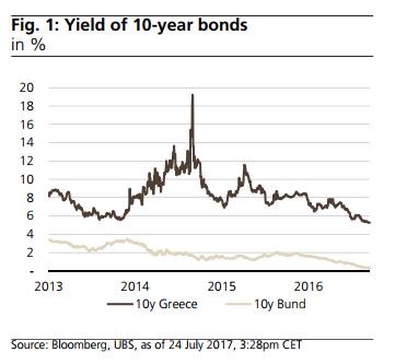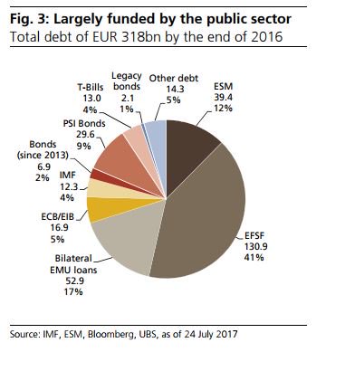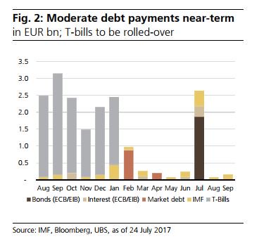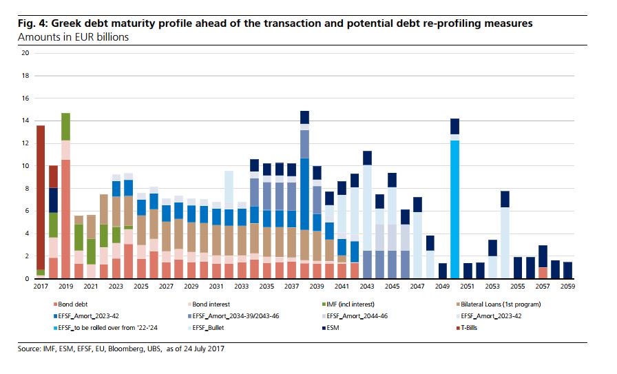 Όπως σημειώνει η UBS, οι Ευρωπαίοι δανειστές εμφανίζονται απρόθυμοι να συγκεκριμενοποιήσουν τα μέτρα ελάφρυνσης πριν τη λήξη του προγράμματος τον Αύγουστο του 2018.