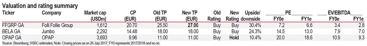 Για την Folli Follie η νέα τιμή στόχος είναι στα 27 ευρώ, ευρώ 25,50 ευρώ, ενώ οι τιμές στόχοι για Jumbo και ΟΠΑΠ είναι 18 και 11 ευρώ προηγουμένως
