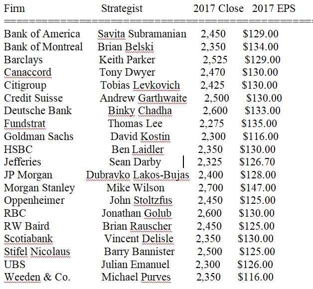 Πιο ειδικά ο παρακάτω πίνακας παρουσιάζει τις εκτιμήσεις από τους αναλυτές, πού θα φτάσει ο δείκτης Standard & Poor's 500 στο κλείσιμο του 2017 για κάθε τράπεζα και πόσα θα είναι τα κέρδη ανά μετοχή.