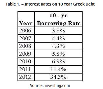 Ο Πίνακας 1 παρουσιάζει τα επιτόκια του 10ετούς χρέους της Ελλάδας για τα εν λόγω έτη.