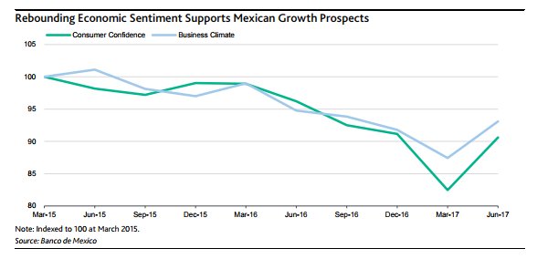 Τον Ιούνιο, η Moody's αναθεώρησε επί τα βελτίω τις προβλέψεις της για την οικονομική ανάπτυξη του Μεξικού σε 2,1% το 2017, από 1,4% στο παρελθόν, και στο 2,5% το 2018 από 1,9%.