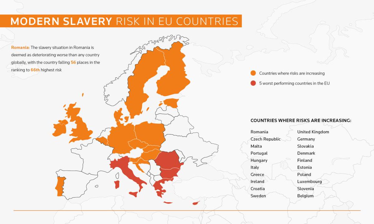 Η Ελλάδα, η Ιταλία, η Κύπρος, η Ρουμανία και η Βουλγαρία είναι οι χώρες με τα υψηλότερα ποσοστά μοντέρνας δουλείας στην Ε.Ε.