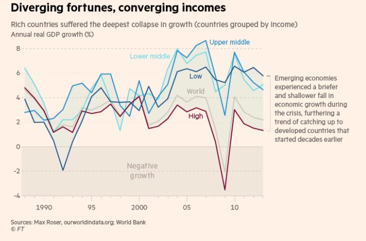 Εξηγώντας, η ανισότητα μεταξύ των χωρών συνέχισε να συρρικνώνεται, όπως συμβαίνει εδώ και δεκαετίες, καθώς η ανάπτυξη στις προηγμένες οικονομίες υπέστη βαθύτερο και πιο παρατεταμένο πλήγμα.
