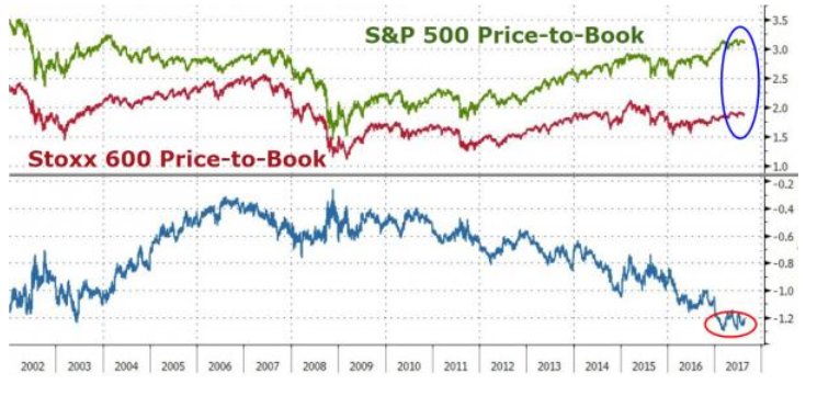Σύμφωνα με τα δεδομένα, οι μετοχές του δείκτη Stoxx Europe 600 διαπραγματεύονται 1,8 φορές με βάση τον δείκτη P/BV δηλαδή τιμής προς λογιστική αξία, σχεδόν 50% χαμηλότερα από εκείνο των μετοχών του δείκτη S&P 500 που διαμορφώνεται στο 3,2.