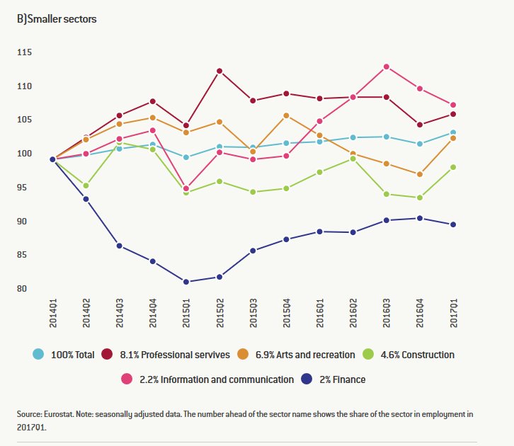 Οι τομείς με τις πιο αδύναμες θέσεις εργασίας είναι οι χρηματοπιστωτικές και ασφαλιστικές δραστηριότητες (πιθανότατα λόγω της αναπόφευκτης αναδιάρθρωσης του τραπεζικού τομέα) και της γεωργίας.