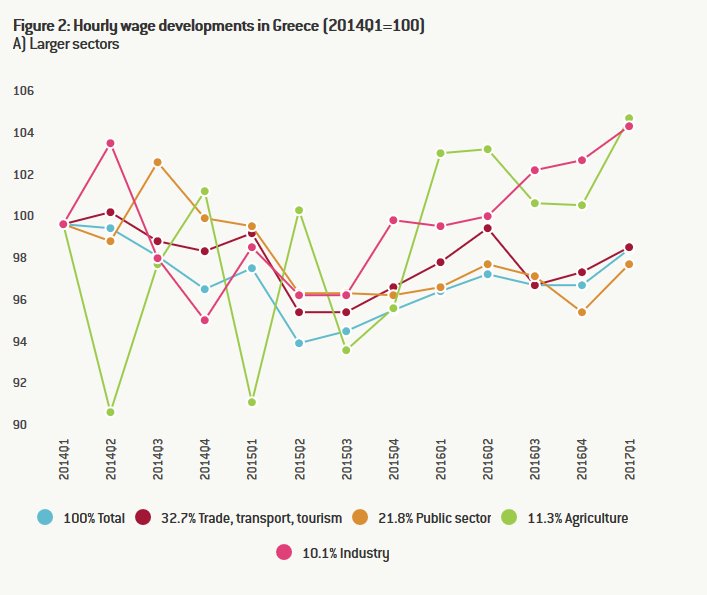 Ωστόσο, όπως δείχνει το σχήμα 2, από το τρίτο τρίμηνο του 2015 οι ωριαίοι μισθοί αυξάνονται στους περισσότερους τομείς (σημειώστε ότι τα τριμηνιαία στοιχεία είναι κάπως ασταθή).
