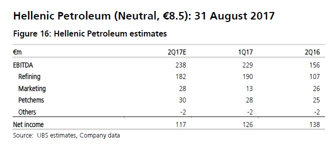 Για τα ΕΛΠΕ εκτιμά ότι τα EBITDA του β' 3μηνου του έτους θα ανέλθουν στα 238 εκατ. ευρώ, με τα καθαρά κέρδη στα 117 εκατ. ευρώ
