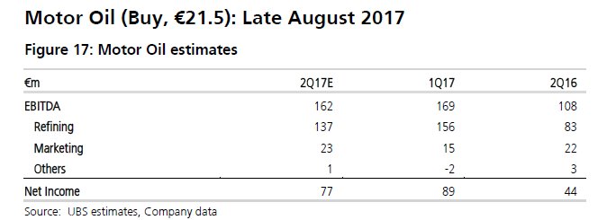 Στην τελευταία ανάλυσή της για τον ευρωπαϊκό κλάδο διυλιστηρίων, η UBS ειδικά για τη Motor Oil αναμένει ένα ακόμη πολύ καλό τρίμηνο, με την εισηγμένη να επωφελείται από τα συμβόλαια που είχαν συναφθεί το πρώτο εξάμηνο του έτους.