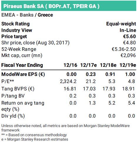 Σύμφωνα με την Morgan Stanley, τα αποτελέσματα της Πειραιώς ήταν σύμφωνα με τις εκτιμήσεις της, ενώ ο σχηματισμός των NPLs ήταν αρνητικός για δεύτερο διαδοχικό τρίμηνο.