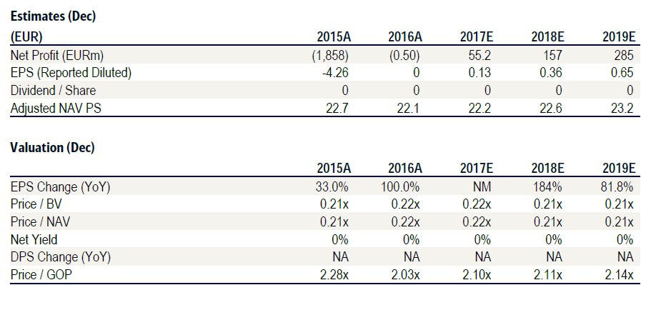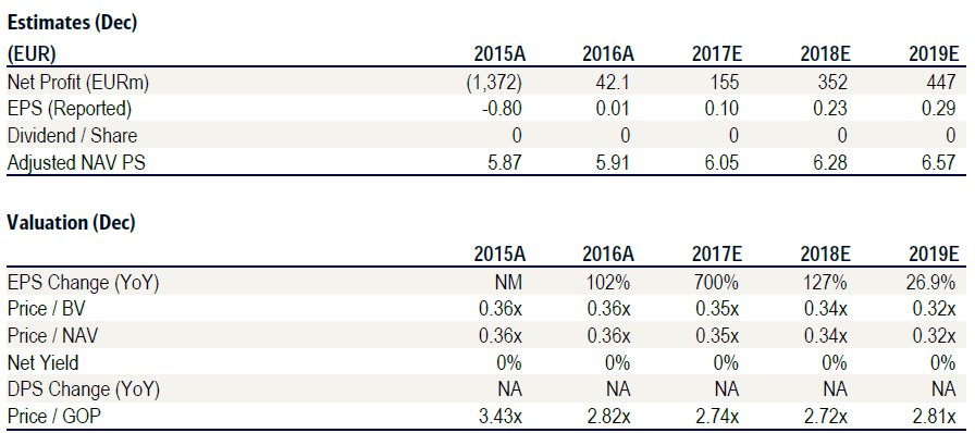 Η Morgan Stanley, δίνοντας τη σύσταση equal-weight (αποδόσεις ίδιες με αυτές της αγοράς), τοποθετεί την τιμή στόχο στα 5,60 ευρώ.