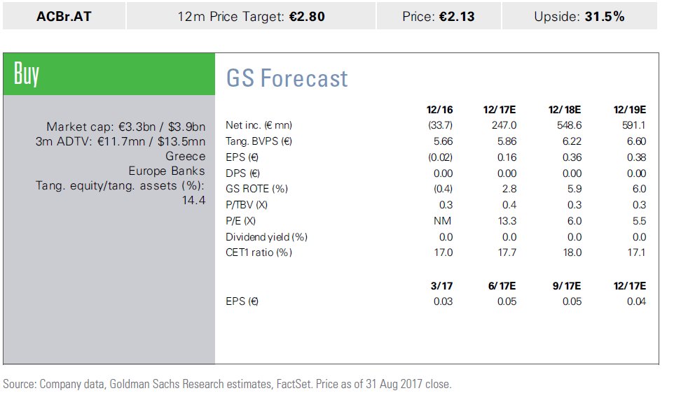 Buy (αγορά) συστήνει η Goldman Sachs για την Alpha Bank, μετά και την ανακοίνωση των αποτελεσμάτων β' 3μηνου του 2017, ενώ αντίθετα η Bank of America Merrill Lynch δίνει σύσταση underperform (αποδόσεις χειρότερες από αυτές της αγοράς).
