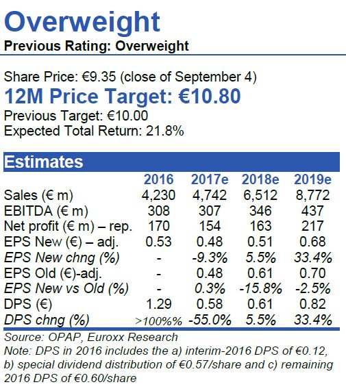 Με τη σύσταση overweight, ήτοι για αποδόσεις καλύτερες από αυτές της αγοράς, και αυξημένη την τιμή στόχο στα 10,80 ευρώ, από 10 ευρώ προηγουμένως, σχολιάζει τις τελευταίες εξελίξεις στον ΟΠΑΠ η Euroxx.