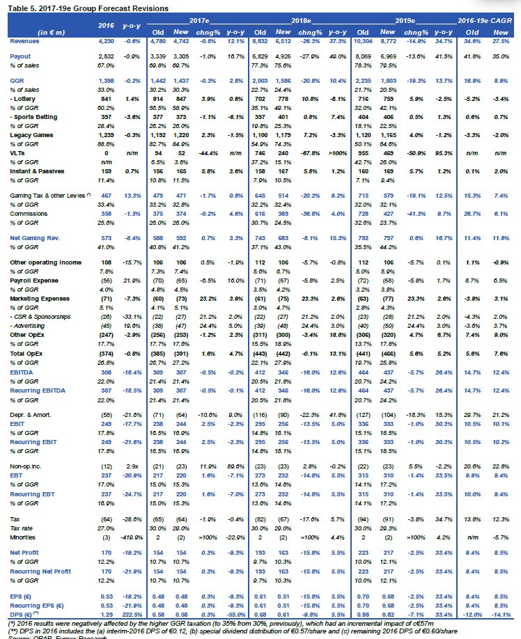 Η διοίκηση ήδη έχει επιλέξει τους νέους στρατηγικούς τεχνολογικούς συνεργάτες της για την ενίσχυση των ψηφιακών / τεχνολογικών δυνατοτήτων του και την αναβάθμιση των βασικών υπηρεσιών, έχει ήδη προχωρήσει στην ανάπτυξη των VLTs που θα αντικαταστήσουν σταδιακά τα παιχνίδια παρακολούθησης (έχουν εγγενώς τα ίδια χαρακτηριστικά προσφέροντας μια πολύ καλύτερη εμπειρία), έχει συμφωνήσει με τους πράκτορες της μια νέα πενταετή δομή ανάθεσης με βάση το NGR (έναντι πονταρίσματος), τα οφέλη των οποίων θα πρέπει να ενισχύσουν την ανταγωνιστικότητα του και (δ) στην έκδοση του 5ετούς ομολογιακού δανείου (Μάρτιος 2017) συγκέντρωσε 200 εκατ. ευρώ με απόδοση 3,5%.