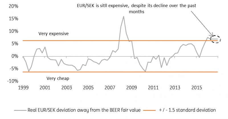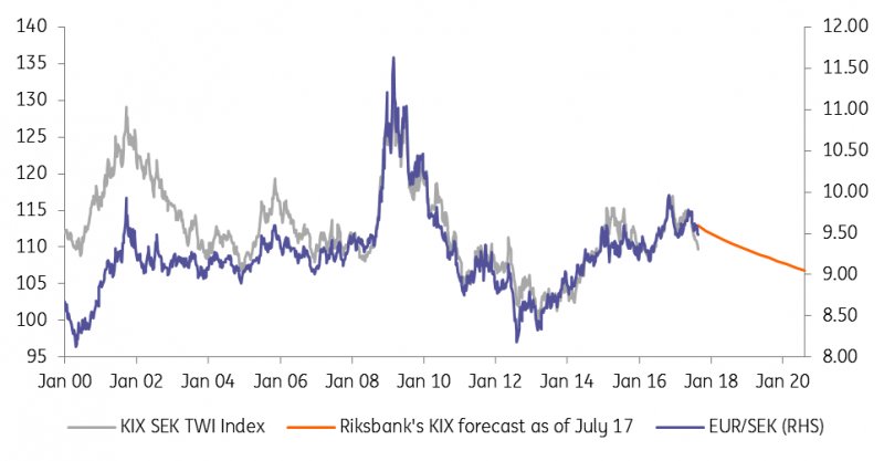 Η ING εκτιμά πως η σουηδική κορώνα θα ενισχυθεί στις 9,1-9,2 ανά ευρώ (έναντι 9,5 που βρίσκεται τώρα) στο τέλος του 2017, για να φτάσει το επόμενο έτος στις 8,8, οπότε και θα δωθεί το «σήμα» στην Τράπεζα για αύξηση του ιστορικά χαμηλού βασικού επιτοκίου του 0,50%.