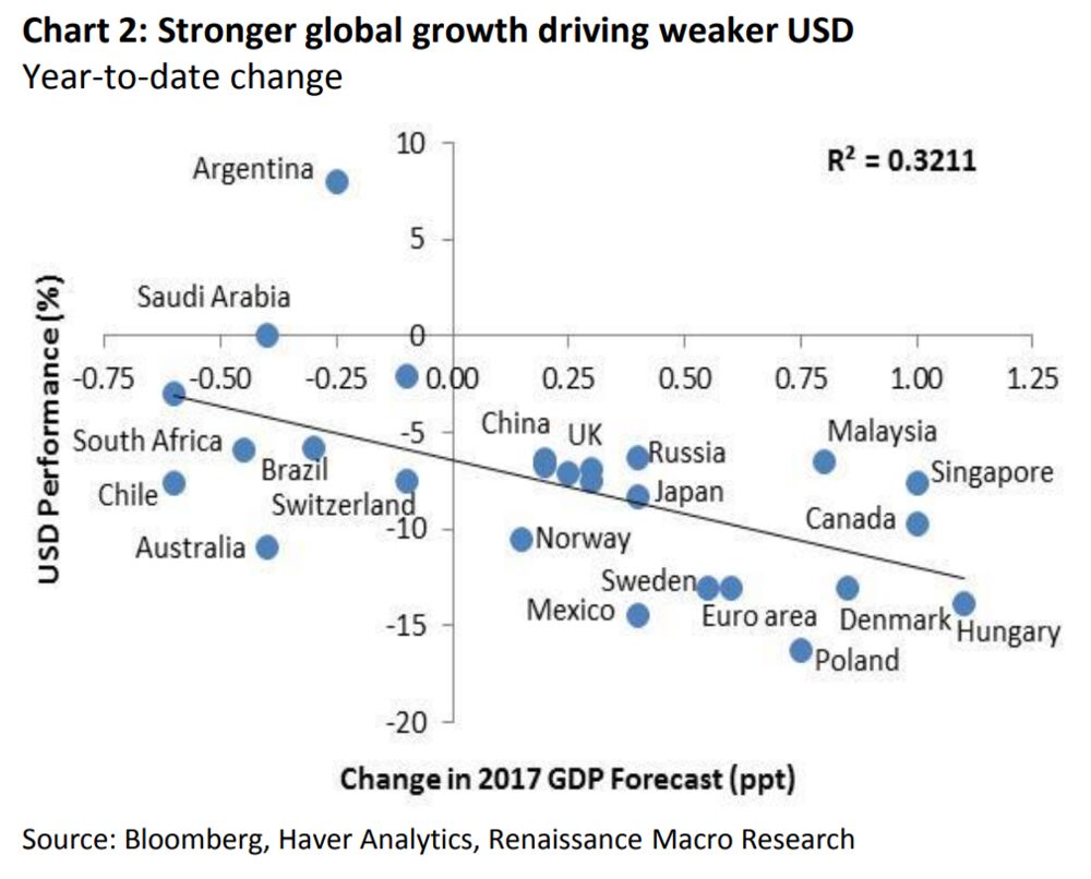 Οι ετήσιες εκτιμήσεις για το αμερικανικό ΑΕΠ το 2017 έχουν κυμανθεί στο εύρος του 2,1% έως 2,3%, κάτι που οδηγεί τον Dutta στο συμπέρασμα ότι η αδυναμία του δολαρίου «είναι συνάρτηση της ισχυρότερης ανάπτυξης στο εξωτερικό».