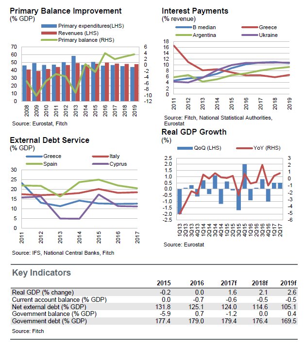 Στις 18 Αυγούστου του 2017 η Fitch Ratings αναβάθμισε την οικονομία της Ελλάδα σε «B-» από το «CCC», αντανακλώντας την άποψή μας ότι η βιωσιμότητα του δημόσιου χρέους θα βελτιωθεί σταθερά, υποστηριζόμενη από την συνεχή συμμόρφωση με τους όρους του Ευρωπαϊκού Μηχανισμού Σταθερότητας (ESM) αλλά και τον μειωμένο πολιτικό κίνδυνο, τη σταθερή αύξηση του ΑΕΠ και τα πρόσθετα δημοσιονομικά μέτρα που θα θεσπιστούν μέχρι το 2020.