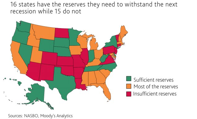 Οι αμερικανικές πολιτείες διακρατούν σε αποθεματικά διαθέσιμα, με βάση το τρέχον νομοθετικό πλαίσιο, το 8% του ετήσιου προϋπολογισμού της, προκειμένου να αντιμετωπίσουν μία ενδεχόμενη μεγάλη κρίση, όπως η χρηματοπιστωτική, το 2007-2009.